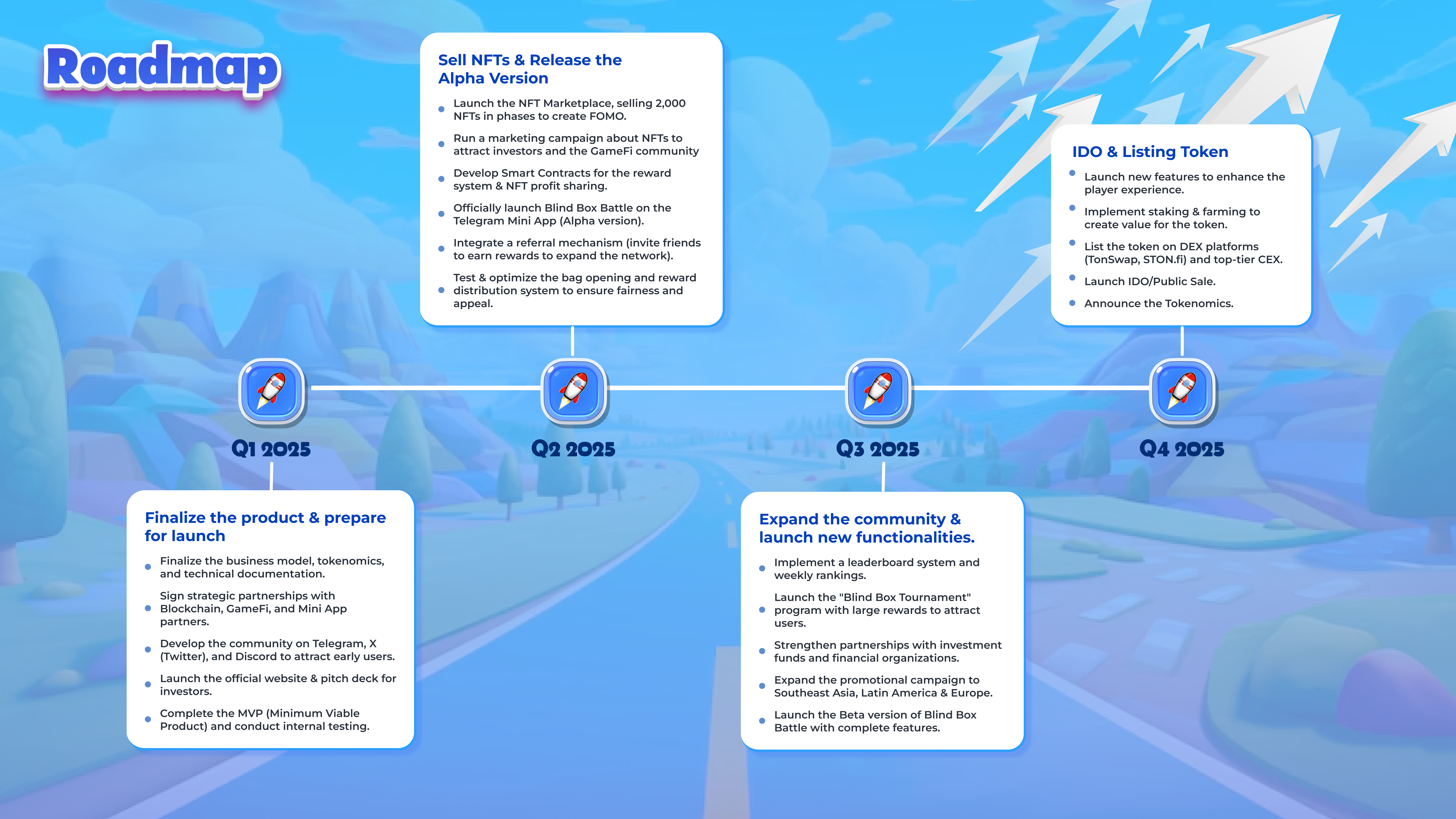 | Q2/2025    | Launching Alpha version, selling NFT, introducing task systems and Referral.                                         |
